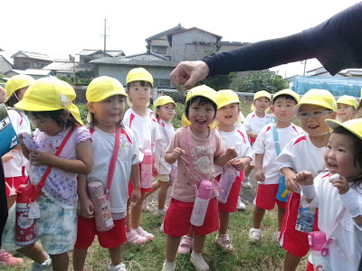 今日はとっても暑い日でしたが、ばら1組と4組で、日陰や涼しい道を通りながら、てくてくお散歩に行ってきました。畑につくと、大きなバッタを発見!おいものかわいいハートの葉っぱを見て、おやつも食べて、楽しいお散歩でした。