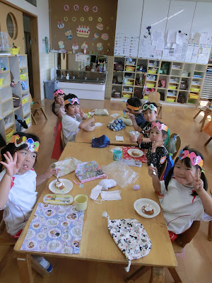 運動会をがんばったもも組さん。今日、運動会をがんばったねパーティーをしました。何が楽しかったか、何をがんばったかを聞くと、踊りや戸板山などたくさん出てきました。はりきりまんとはりきりがーるから旗をもらいトッピングをしてとても楽しいパーティーでした。