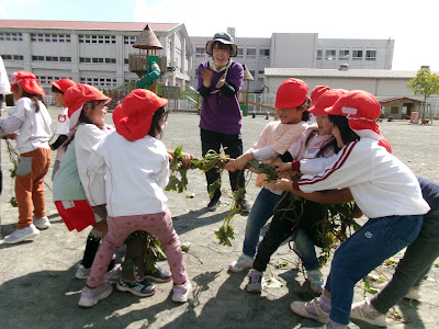 ゆり組さんが幼稚園の畑で大切に育ててきたさつまいもを収穫しました。「うんとこしょ、どっこいしょ。」力いっぱいつるを引っ張りました。立派なおいもが次から次へと出て来たね。たくさん収穫できました。おいものつるでも遊びました。